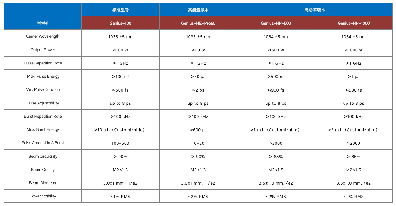 Genius 标准版本:功率范围 ≥100 W/单脉冲能量 ≥100 nJ/脉冲数调节范围 100-500